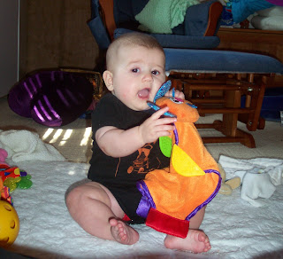 She is on the move! Yesterday, as if in celebration of her daddy's birthday, Miss MJ decided that she was not going to sit still anymore. You can't call her method of movement crawling since she doesn't get up on her hands and knees, but lying on her belly she pushes off with her arms and wiggles her legs and butt to get momentum. She actually did this commando crawl over the space of 2+ feet in under a minute.